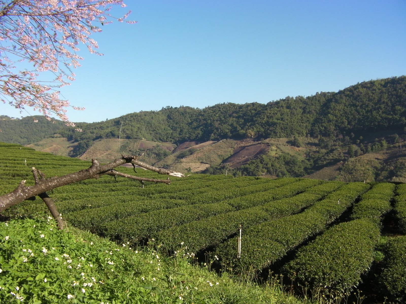 Die heutige Etappe lässt sich in 2 Teile aufteilen. Der erste Teil führte entlang eines Höhenkamms, vergleichbar mit der Route im Tösstal über’s Hörnli. Statt Tannen und Wiesen führte die Strasse an Teeplantagen, Bambuspflanzen und Bananenstauden entlang. Unten im Tal entschied ich mich, wieder gegen Norden nach Mae Sai zu fahren. Mae Sai ist der nördlichste Ort Thailands und liegt an der burmesischen Grenze. Für 500 Baht bekommt man ein Tagesvisum. Mal schauen ob ich noch einen kurzen Abstecher nach Burma mache.