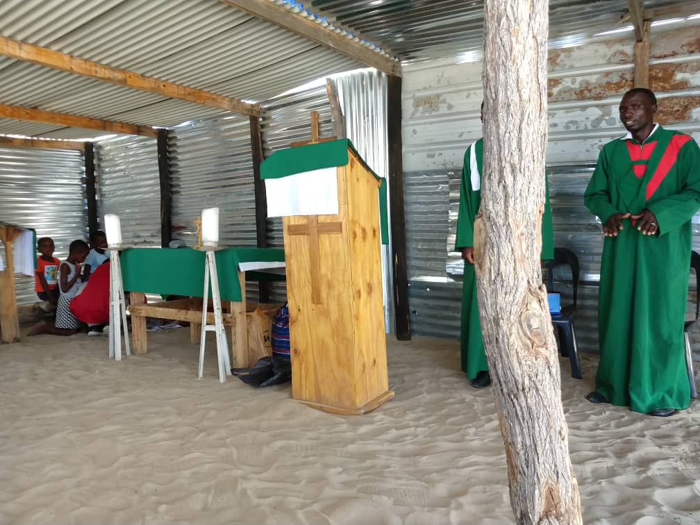 Unser Watchman Muronga ist Laienprediger in der römisch katholischen Kirche St. Monica. Diese befindet sich im Stadtteil Ndama in Rundu. Viele Einwohner dieses Stadtteils leben in sehr einfachen Verhältnissen. So auch Muronga und seine Familie. Die Behausungen sind aus Wellblech und bestehen aus einem Raum. Der Schlafbereich wird meist nur mit einem Tuch vom Wohn- und Essbereich abgetrennt. Viele Bewohner kochen auf dem offenen Feuer und verfügen über keinen Wasseranschluss. Hauptbeschäftigung der Frauen besteht daher aus der Beschaffung von Feuerholz und Wasser. Muronga hat uns schon seit einiger Zeit zum Besuch eines Gottesdienstes in “seiner” Kirche eingeladen. Letzten Sonntag war es soweit. Wie vereinbart trafen wir uns am Morgen bei seiner Hütte. Zu Fuss ging es weiter zur Kirche. Die Kirchenbesucher tragen Plastikstühle mit, da es in der Kirche weder Bänke noch Stühle gibt. Die Kirche wurde ebenfalls aus Wellblech errichtet. Zur Zeit stehen erst auf zwei Seiten Wände. Auch das Dach, ebenfalls aus Wellblech, ist noch nicht komplett fertig gestellt. Daher sind die wichtigen Schattenplätze beschränkt. Auch die Einrichtung ist sehr simpel. Ein einfacher Altar, ein Holzkreuz und ein kleines Rednerpult. Muronga wünscht sich eine kleine Sakristei, damit er das Predigergewand nicht vor allen Kirchengängern anziehen muss. Aber Priorität hat die Fertigstellung des Daches. Da die Messe in der einheimischen Sprache Rukwangali gehalten wurde, gab uns eine Messdienerin eine englische Bibel und zeigte uns die entsprechenden Bibeltexte. Die ganze Kirche lauschte andächtig der Predigt von Muronga. Sogar die vielen Kinder waren mehr oder weniger bei der Sache. Im Unterschied zu den Gottesdiensten in Europa, ist das Durchschnittsalter der Kirchengänger hier sehr tief. Mitreißend waren dann vor allem die Gesangs- und Tanzeinlagen des Frauenchors. Die Kollekte wurde gleich zweimal gesammelt. Zuerst für die Mission in Rundu und anschliessend für die Erweiterung der eigenen Kirche. Die zweite Kollekte wurde in Form eines Wettbewerbs, Männer gegen Frauen, abgehalten. Sieger ist, wer mehr Geld zusammen bringt. Der Wettbewerb endete mit einem klaren Sieg der Frauen, wobei man sagen muss, dass etwa drei viertel der Anwesenden Frauen waren. Zum Schluss durften Rahel und ich uns kurz vorzustellen und ein paar Worte über uns sagen. Nach dem Gottesdienst wurden wir sehr herzlich verabschiedet und liebenswürdig aufgefordert, bald wieder zu kommen.